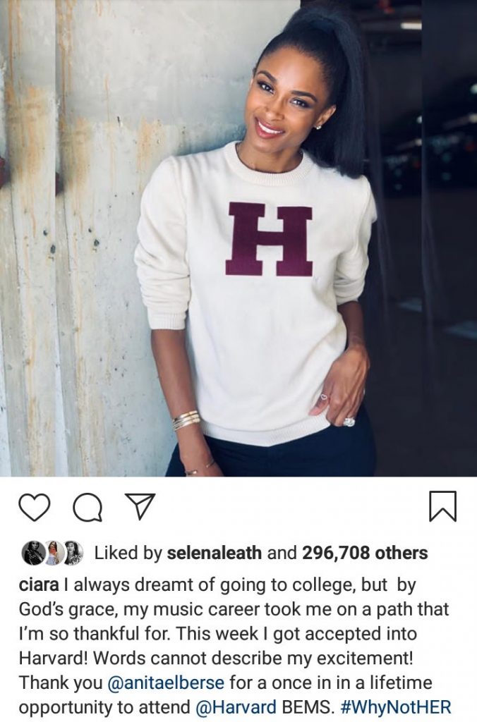Sharing a photo of herself rocking the school’s apparel, she wrote: “I always dreamt of going to college, but by God’s grace, my music career took me on a path that I’m so thankful for. This week I got accepted into Harvard! Words cannot describe my excitement! Thank you @anitaelberse for a once in in a lifetime opportunity to attend @Harvard BEMS. #WhyNotHER