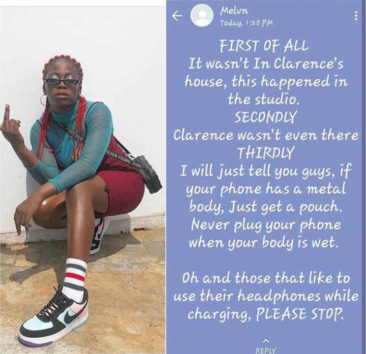 Melvn said Kodak was charging her phone which has a metal cover and she was also trying to use a metal socket while her body was sweaty with no shoes. He added that, suddenly, they heard a bang which got them curious.