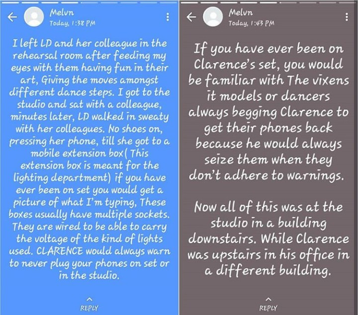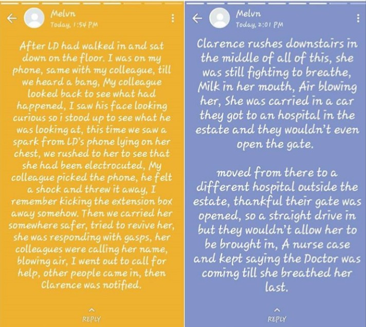 “We looked back to see what happened and saw a spark on LD’s phone lying on her chest, we rushed to her to see that she had been electrocuted,” the Melvin said.