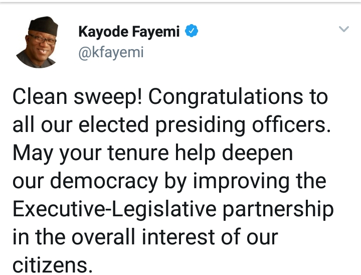 The Governor of Ekiti State, Kayode Fayemi took to his Twitter account to congratulate all the presiding officers elected into the 9th National Assembly and National Legislators.