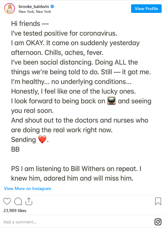 Baldwin, who hosts “CNN Newsroom with Brooke Baldwin,” from the network’s offices in New York City, is now the second CNN anchor to be infected with Coronavirus after Chris Cuomo announced his positive diagnosis on Tuesday.