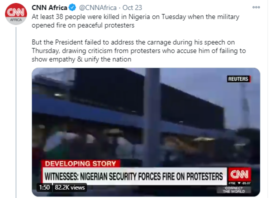 On October 23, CNN Africa had tweeted that at least 38 persons were killed on Tuesday, October 20, when the military opened fire on peaceful protesters. This tweet was referring to the Lekki shooting incident.