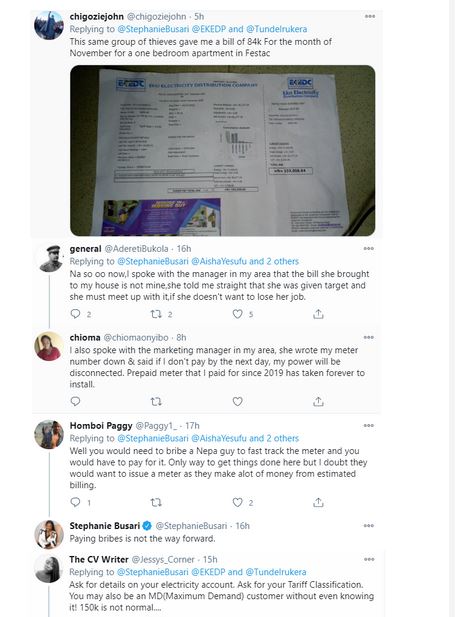 Busari in a tweet posted on her handle said she was hardly in her home in December 2020 and was shocked to receive a bill of N150, 000 from PHCN.