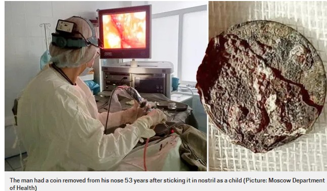 Medics carried out endoscopic surgery under general anaesthetic removing the stones and retrieving the Soviet one kopek coin from his nose after 53 years.