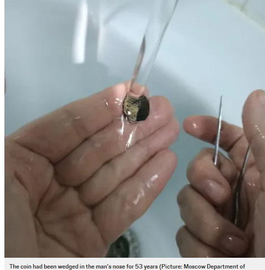 The 59-year-old unnamed Russian man was aged just six when he wedged the money into his right nostril.