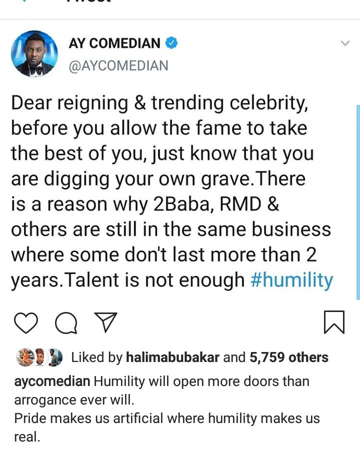 The comedian warned celebrities to avoid letting the fame get to their heads such that they become proud. He explained that those who have remained relevant after years in the entertainment industry are people who stayed humble.