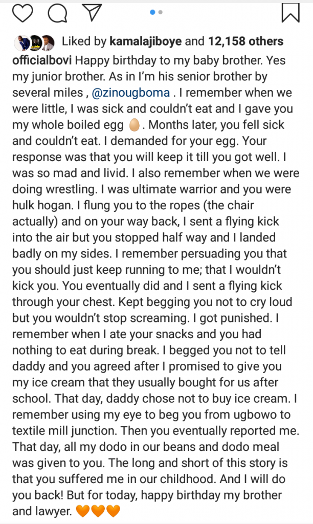 Happy birthday to my baby brother. Yes my junior brother. As in I’m his senior brother by several miles , @zinougboma . I remember when we were little, I was sick and couldn’t eat and I gave you my whole boiled egg. Months later, you fell sick and couldn’t eat. I demanded for your egg. Your response was that you will keep it till you got well. I was so mad and livid. I also remember when we were doing wrestling. I was ultimate warrior and you were hulk hogan. I flung you to the ropes (the chair actually) and on your way back, I sent a flying kick into the air but you stopped half way and I landed badly on my sides. I remember persuading you that you should just keep running to me; that I wouldn’t kick you. You eventually did and I sent a flying kick through your chest. Kept begging you not to cry loud but you wouldn’t stop screaming. I got punished. I remember when I ate your snacks and you had nothing to eat during break. I begged you not to tell daddy and you agreed after I promised to give you my ice cream that they usually bought for us after school. That day, daddy chose not to buy ice cream. I remember using my eye to beg you from ugbowo to textile mill junction. Then you eventually reported me. That day, all my dodo in our beans and dodo meal was given to you. The long and short of this story is that you suffered me in our childhood. And I will do you back! But for today, happy birthday my brother and lawyer.
