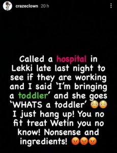 Popular Instagram comedian, Craze Clown has disclosed what made him change his mind about taking his daughter to a hospital in Lekki.