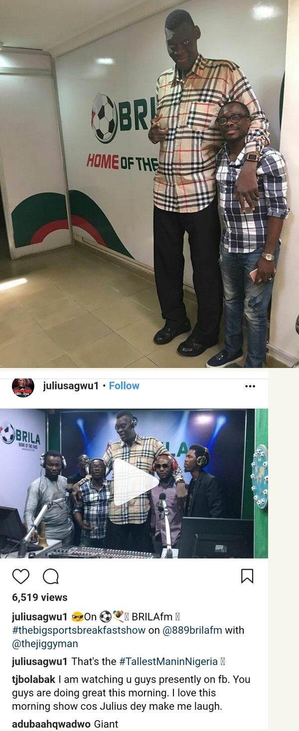 Nigerian Comedian Julius Agwu shared a photo of him standing next to Agoro, said to be the tallest man in Nigeria.