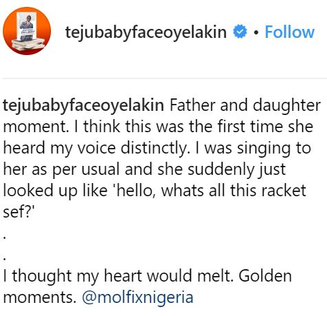 Nigerian comedian, Teju Babyface has been caught on camera sharing a very lovely father-daughter moment with his child.