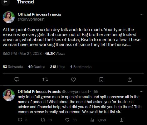 The comment did not sit well with Doyin and Princess Francis as both have taken to their pages to drag the singer.