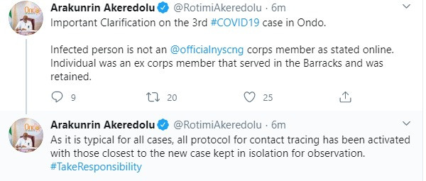 Ondo state governor, Rotimi Akeredolu, has debunked reports that a member of the National Youth Service Corps tested positive for coronavirus to become the state’s third Coronavirus patient.