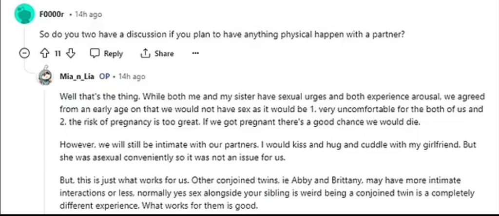 In the AMA (Ask Me Anything) subreddit, Mia and Lia explained why they no longer masturbate because it’s too ‘uncomfortable’ for them as they share the ‘same vagina.’