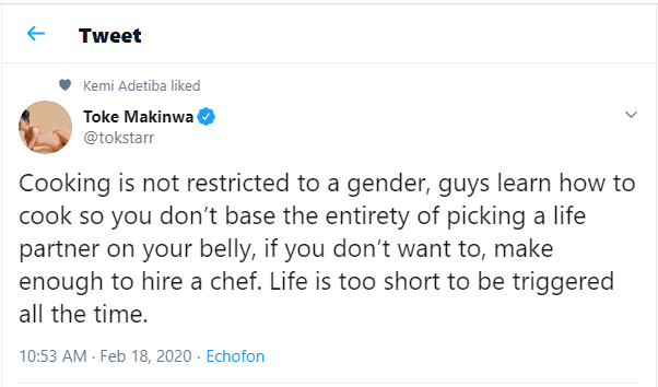 Media personality, Toke Makinwa, who believes cooking shouldn’t be restricted to a gender want men to learn how to cook and not base the ‘entirety of picking a life partner’ on their belly.