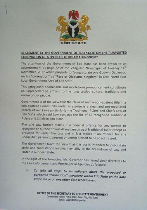 According to press release by Edo government, governor Godwin Obaseki has ordered the arrest and investigation of all those involved in the coronation, declaring that it was another attempt to cause crisis in the state, which according to him, will be resisted.