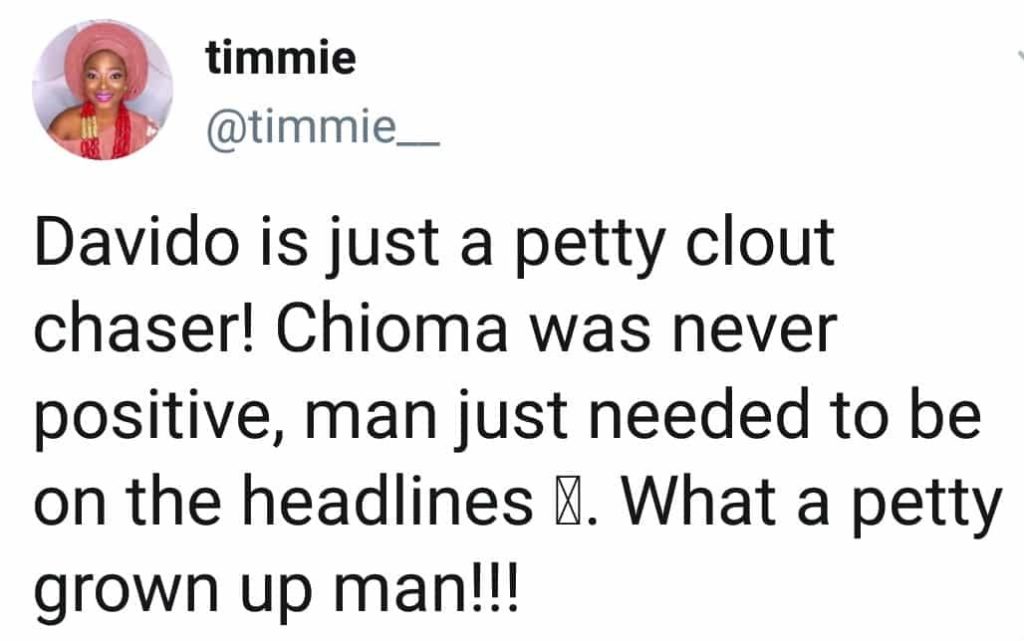 The lady, identified as Timmie on Twitter accused Davido of being a ‘petty clout chaser. She claimed that Davido’s fiancee, Chioma is well and hearty.