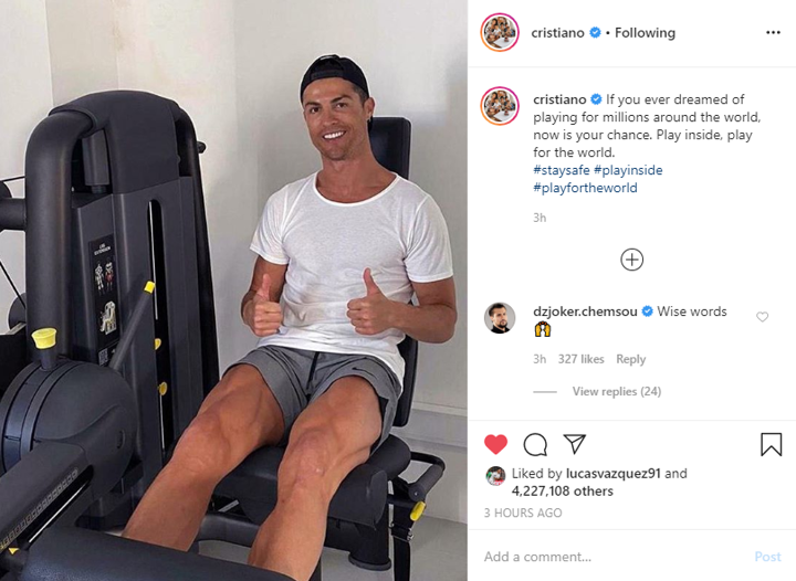 – Ronaldo calls on people to stay at home and ‘play for the world’.