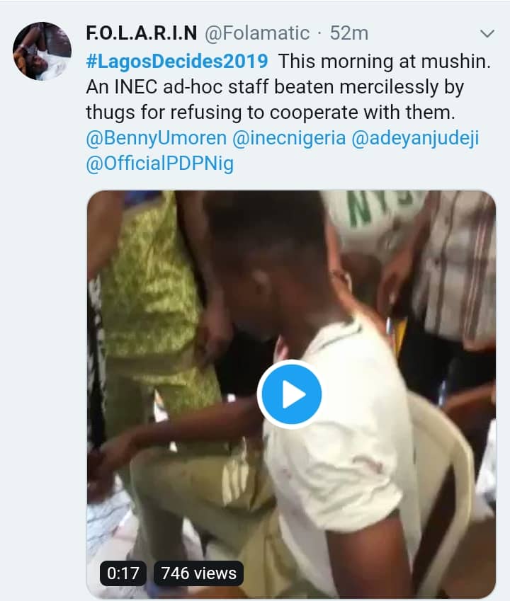 A Corper working as INEC ad-hoc staff was beaten mercilessly by thugs for refusing to cooperate with them this morning in Mushin, Lagos during the governorship election.
