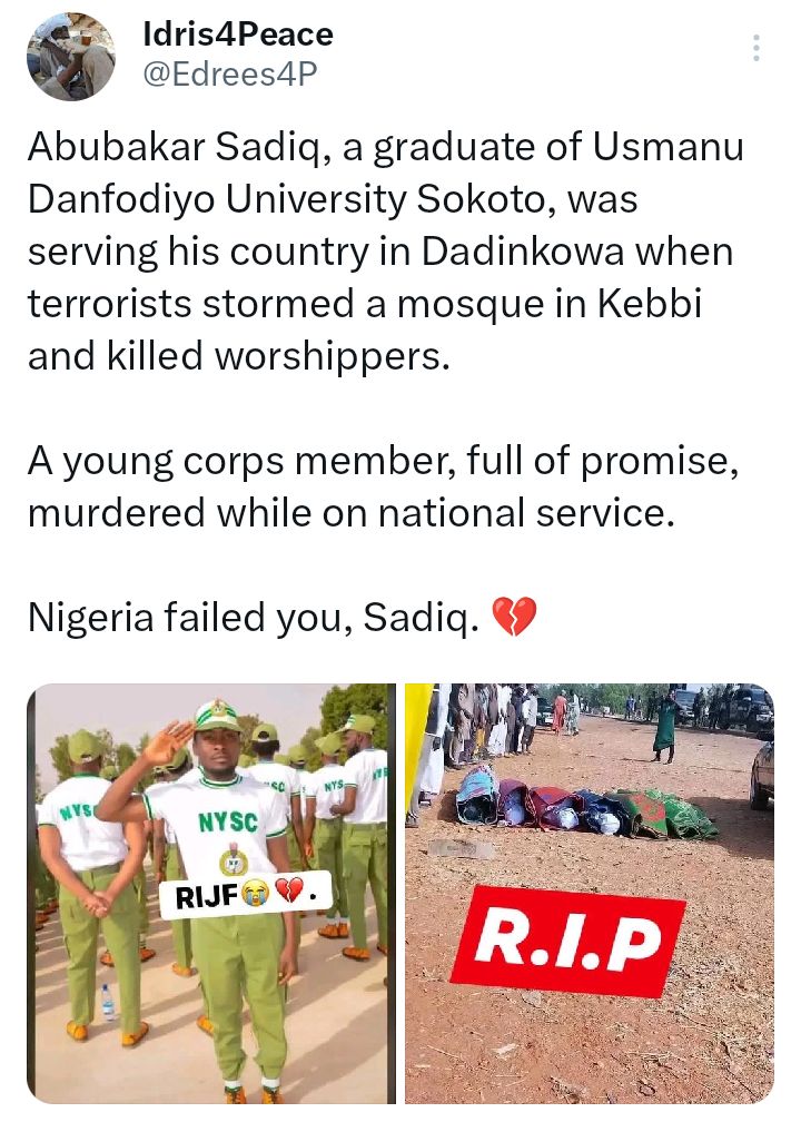 A serving member of the National Youth Service Corps (NYSC) identified as Abubakar Sadiq, was among worshippers k!lled when suspected Lakurawa terrorists attacked a mosque in Dadinkowa community, Maiyama Local Government Area of Kebbi State.