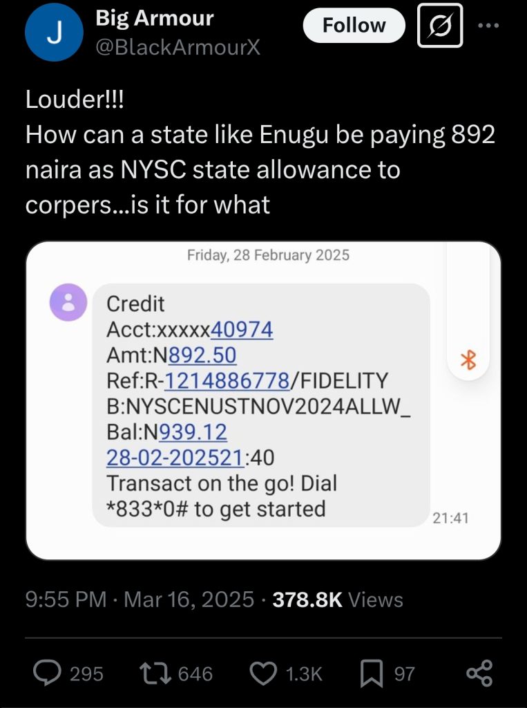 He voiced his frustration in a post shared on X (formerly Twitter), criticizing the state’s low allowance for corps members.