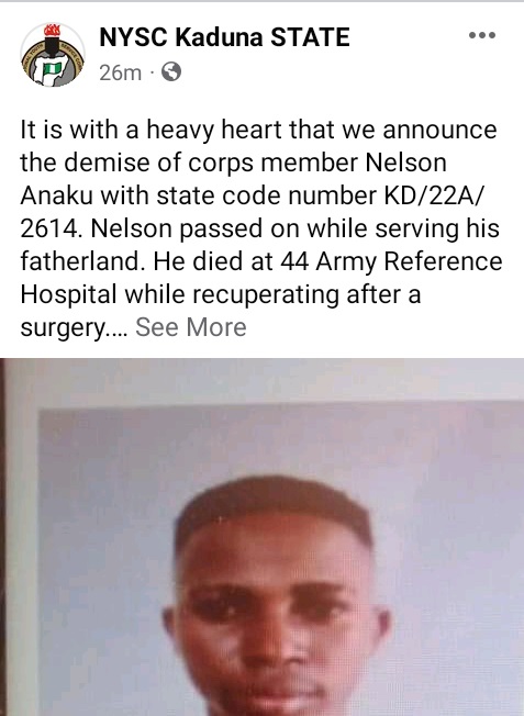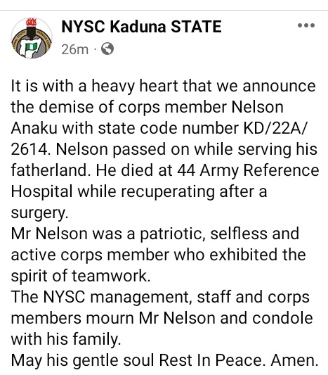 “It is with a heavy heart that we announce the demise of corps member Nelson Anaku with state code number KD/22A/2614.”Nelson passed on while serving his fatherland. He died at 44 Army Reference Hospital while recuperating after a surgery.”Mr Nelson was a patriotic, selfless and active corps member who exhibited the spirit of teamwork”The NYSC management, staff and corps members mourn Mr Nelson and condole with his family.May his gentle soul Rest In Peace. Amen.”