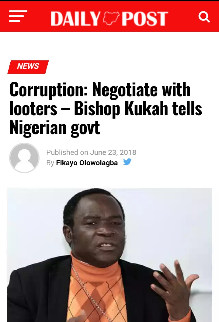 Kukah said the government should negotiate with looters of the nation’s treasury in order to recover stolen funds.