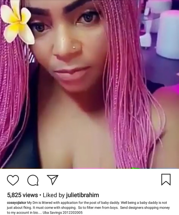 ”My Dm is littered with application for the post of baby daddy. Well being a baby daddy is not just about fking. It must come with shopping. So to filter men from boys. Send designers shopping money to my account in bio…. Uba Savings 2012202005”, she wrote.