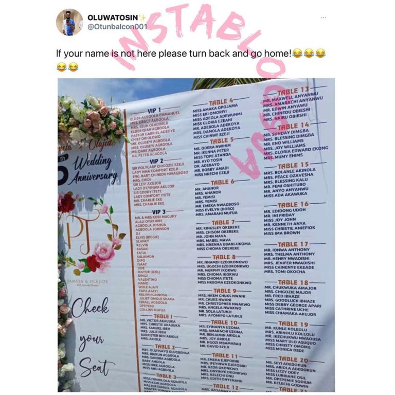 Lagos couple displays the names of those allowed to attend their 5th wedding anniversary