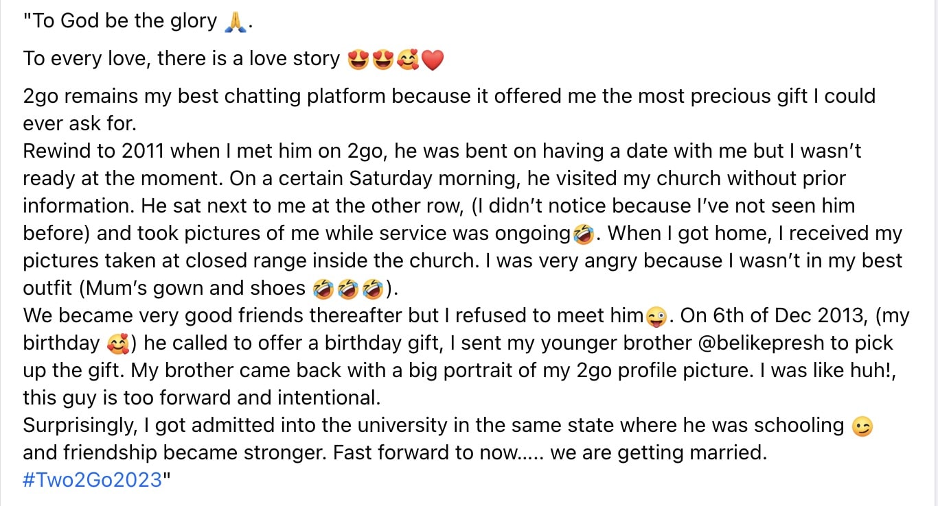 A young couple set to get married narrates the touching story of how they met 12 years ago on a popular social media platform, 2go.