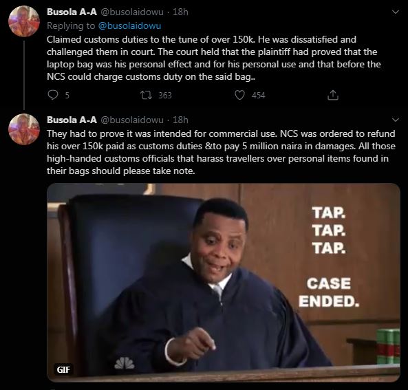 They had to prove it was intended for commercial use. NCS was ordered to refund his over 150k paid as customs duties & to pay 5 million naira in damages. All those high-handed customs officials that harass travellers over personal items found in their bags should please take note.