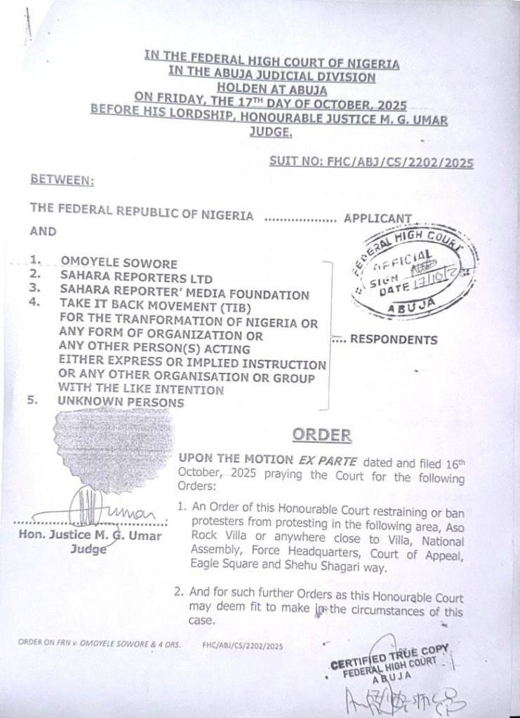 The Federal government had approached the court presided over by Justice M.G Umar, to seek an injunction barring the planned protest from holding in front of the seat of power. Those listed as defendants include Omoyele Sowore, Sahara Reporters Foundation, Take It Back Movement and other unknown persons.