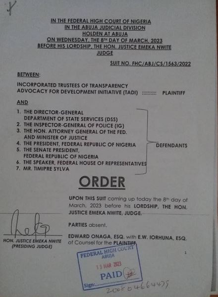 Named as defendants in the case were the Director-General, Department of State Security (DSS), the Inspector-General of Police, the Attorney-General and Minister of Justice, the Senate President, the Speaker of the House of Representatives and Sylva.