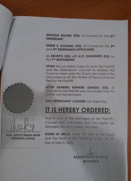 Nwite said: “After hearing Edward Onaga, the counsel to the plaintiff, who conceded that the matter can be dismissed and the defendant counsel not objecting, it is hereby ordered that in view of the plaintiff’s counsel, who conceded that the matter be dismissed, the suit is hereby dismissed”.