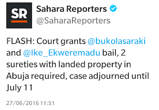 According to Sahara Reporters, Bukola Saraki and his deputy Ike Ekweremadu have been granted bail and case adjourned to July 11th