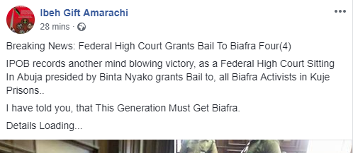 Information reaching the PoliticsNGR newsdesk reveals that IPOB members and Nnamdi Kanu’s cell-mates at Kuje prison, Benjamin Madubogwu and David Nwawuisi and two others, Bright Chimezie and Chidiebere Onwudiwe have been granted bail by the Federal high court in Abuja.