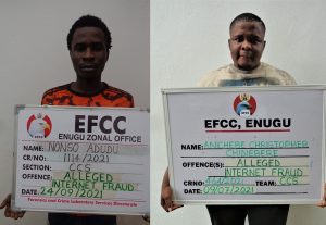 The operatives of the Enugu Zonal Command of the Economic and Financial Crimes Commission, EFCC, on Wednesday, December 1, 2021, secured the conviction of three students: Nonso Adudu, Anichebe Christopher, and Onyedika Austin Leonard, before Justice I.M. Buba of the Federal High Court sitting in Enugu on charges bordering on forgery, impersonation and obtaining money from unsuspecting foreign nationals under false pretenses.
