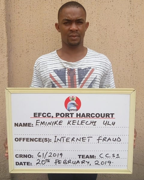 The convict was arraigned by the Economic and Financial Crimes Commission, EFCC, Port Harcourt Zonal Office on Tuesday, May 15,  2019 on one-count charge bordering on false pretence with intent to defraud contrary to section 1(1)(a) of the Advance Fee Fraud  and other Related Offences Act 2006 and Punishable  under Section 1(3) of the same Act. .