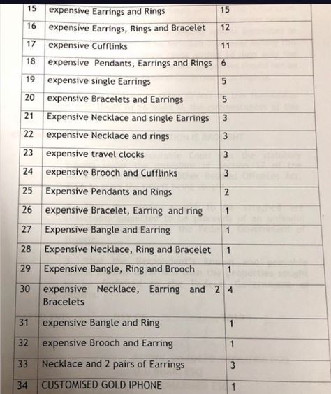 According to the schedule attached to the application, the jewellery, categorised into 33 sets, include “419 expensive bangles; 315 expensive rings; 304 expensive earrings; 267 expensive necklaces; 189 expensive wristwatches; 174 expensive necklaces and earrings; 78 expensive bracelets; 77 expensive brooches; and 74 expensive pendants.”