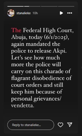 He wrote, “The Federal High Court has directed the Nigerian Police to comply with the order to release Speed Darlington immediately pending the hearing of the substantive matter. “The court further directs Abubakar Marshal, Esq. to stand as surety to Akpi.”