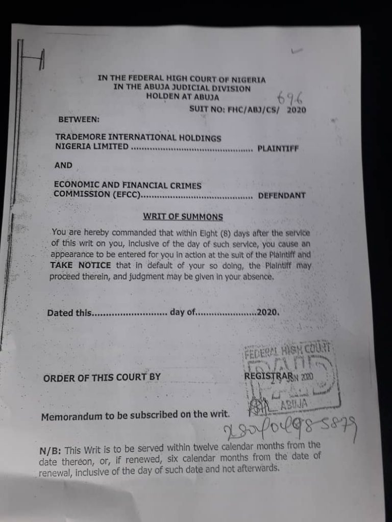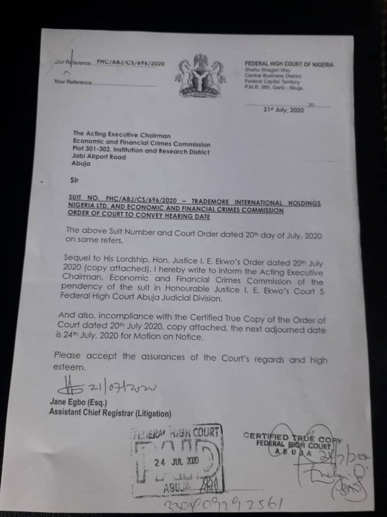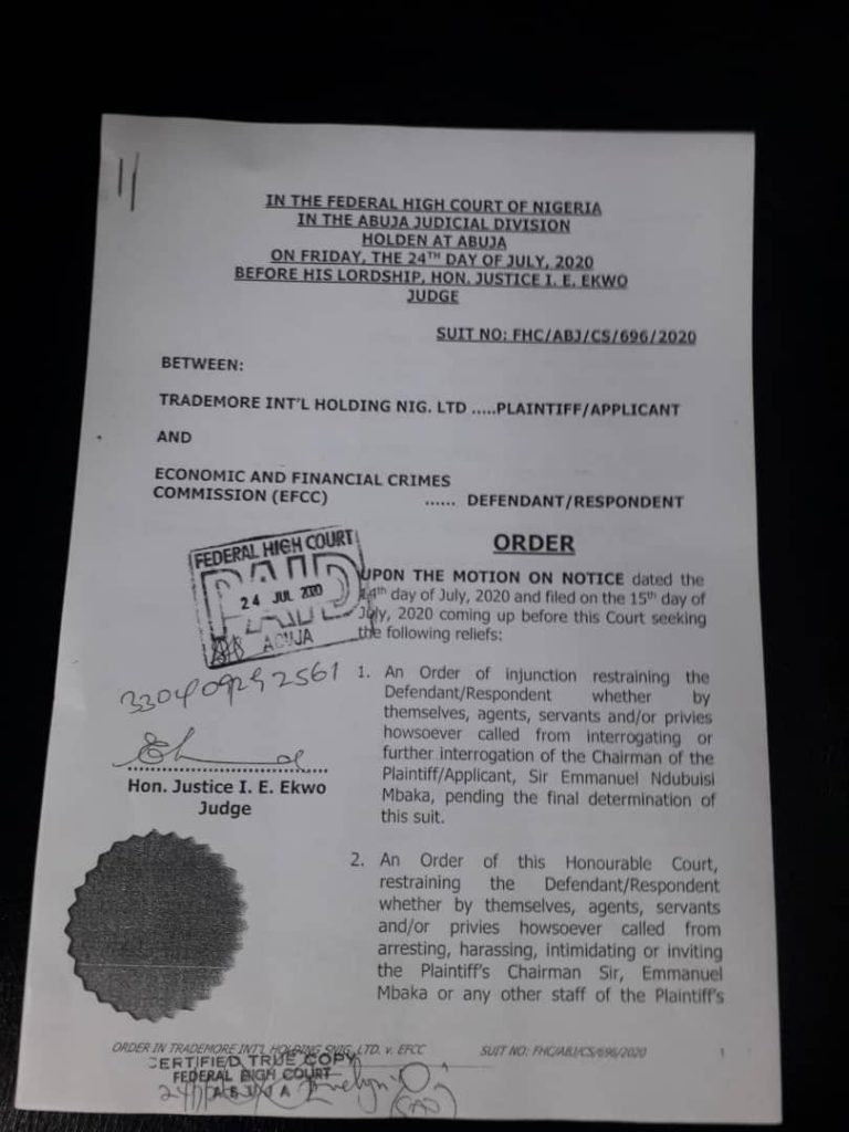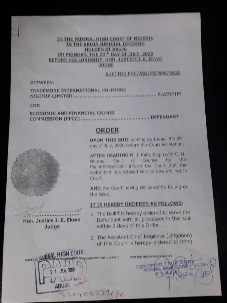 In an Ex Parte order granted July 20, 2020 by Justice I. E. Ekwo, the court restrained the EFCC and its agents from further interrogating, harassing or arresting Trademore boss or any other staff of the company “pending final determination of the suit.”