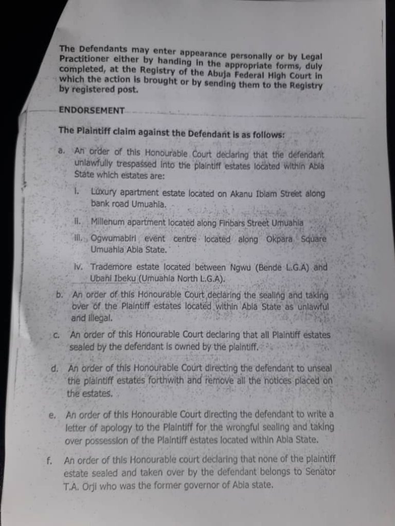 *An order of this Honourable court declaring that none of the plaintiff estate sealed and taken over by the defendant belongs to Senator TA Orji who was the former governor of Abia state