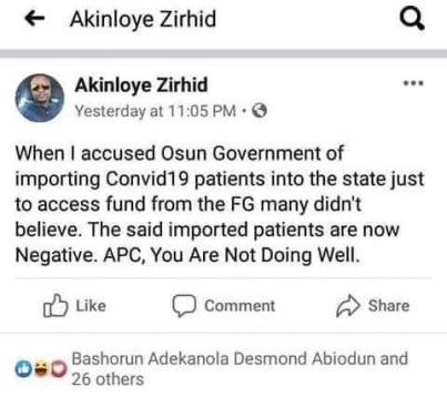 The charge reads, “That you Akinloye Saheed ‘m’ on 11th day of April, 2020 at 11:05pm at Osogbo did interfere with an executive order of the Osun State Government when you published on your Facebook page that ‘When I accused Osun Government of importing COVID-19 patients into the state just to access fund from the FG, many didn’t believe. The said imported patients are now negative. APC, you are not doing well.’