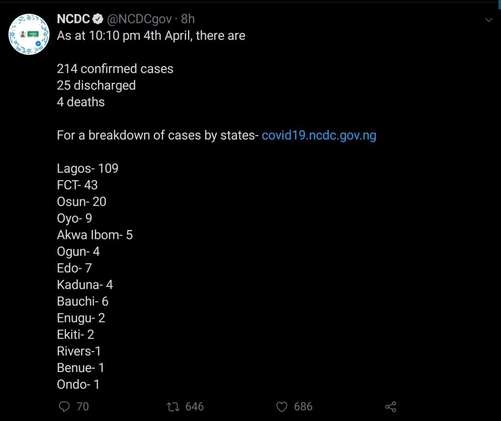 As at 10:10 pm 4th April there are 214 confirmed cases of #COVID19 reported in Nigeria. Twenty-five have been discharged with four deaths