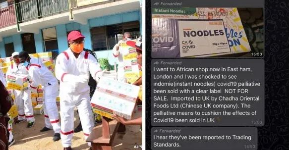 A Twitter user has alleged that cartons of noodles which are COVID-19 palliatives from Nigeria have been spotted for sale in London.