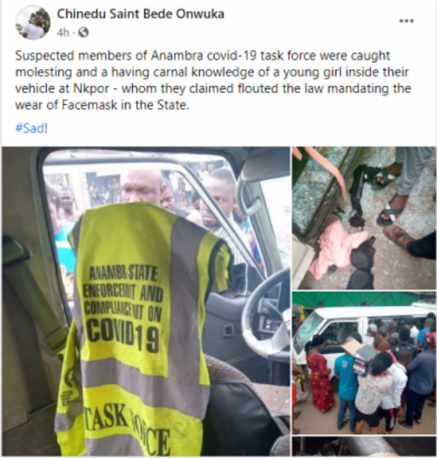 “Suspected members of Anambra covid-19 task force were caught molesting and a having carnal knowledge of a young girl inside their vehicle at Nkpor – whom they claimed flouted the law mandating the wear of Facemask in the State.”
