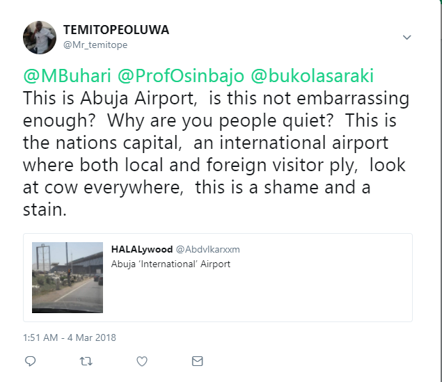 A twitter user uploaded a picture of Cows grazing on the grass located in Abuja airport.