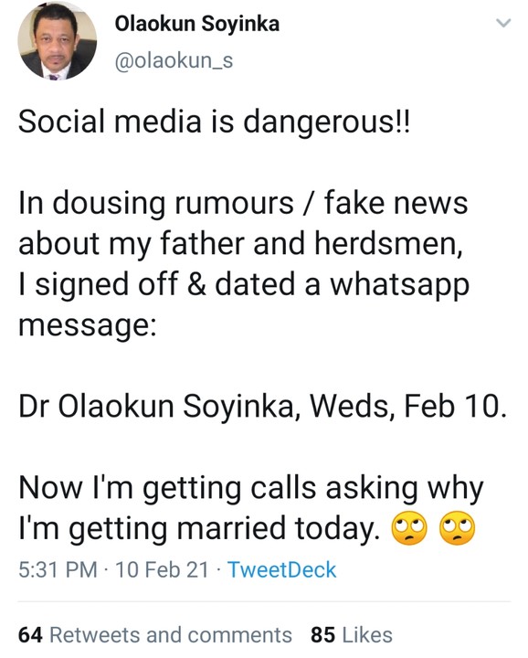 In dousing rumours / fake news about my father and herdsmen, I signed off & dated a whatsapp message:
