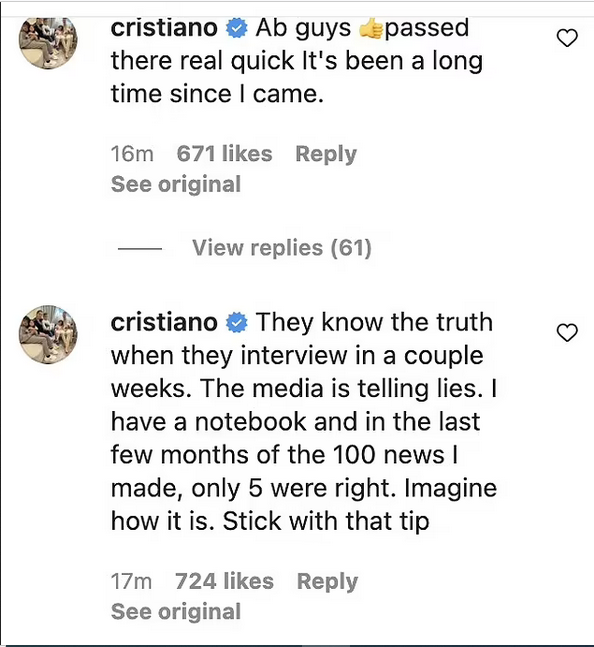 Meanwhile, Ronaldo has replied a fan account on Instagram and accused the media of ‘telling lies’.