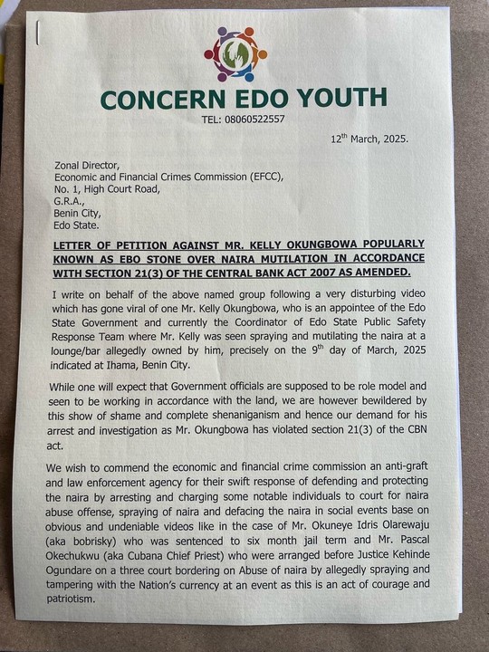 A civil society group, Concerned Edo Youth, has petitioned the Economic and Financial Crimes Commission (EFCC) to investigate Kelly Okungbowa (aka Ebo Stone), a senior Edo State government official, for abuse of the naira after a video surfaced showing him spraying newly minted currency on strippers.