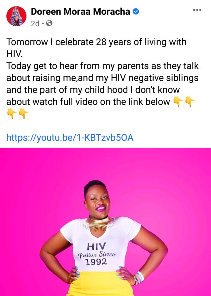 On another post, she wrote; “28 years ago, the Moracha family was blessed with a baby girl, her name Doreen Moraa Moracha. 8 years later she was diagnosed with HIV. There were no ARVs and no hope that she would live to see her 28th birthday today I celebrate LIFE because I AM GREATER THAN HIV and a fabulous host to a tiny guest. HAPPY BIRTHDAY TO ME”
